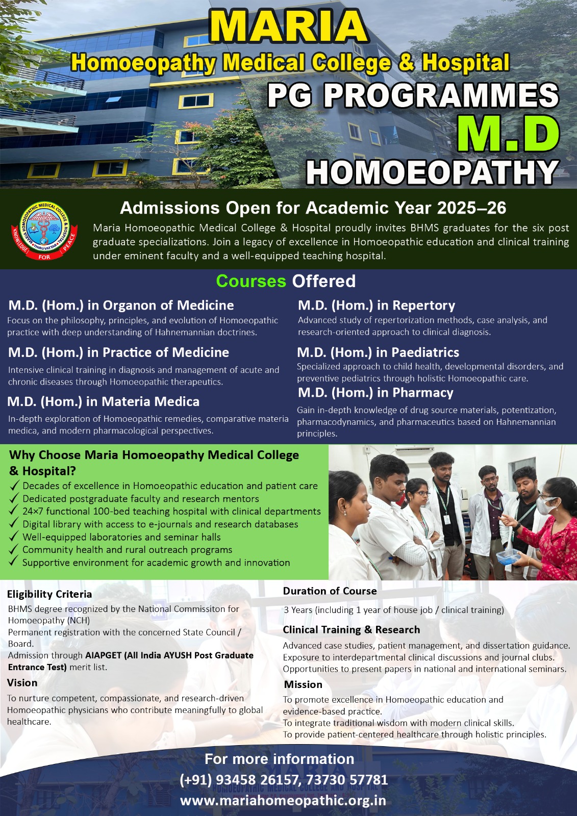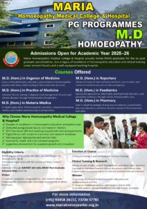 Founded in 2014, Maria Homeopathic Medical College& Hospital was born from a commitment to enhance healthcare through homeopathy. Our mission is to train future practitioners and promote holistic healing.